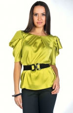 Вырез горловины оформлен встречной складкой на груди. Силуэт блузки позволяет носить данную модель навыпуск с поясом и комбинировать с брюками.